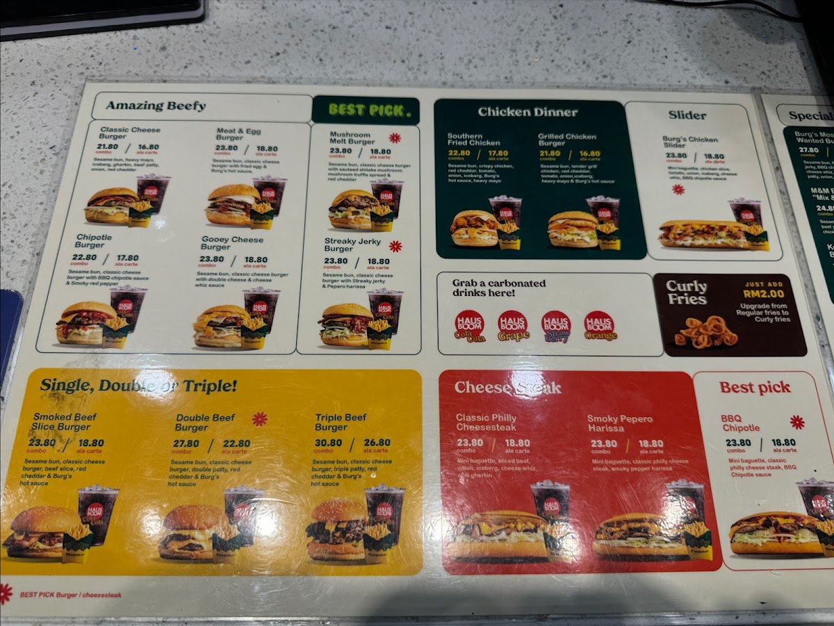 For those with a more indulgent appetite, the "Triple Beef Burger" offers layers of bold flavors, with three juicy beef patties for MYR 39.65. As one customer aptly summarized, "Do not eat anything before coming here," emphasizing the generous portion sizes and satisfaction you can expect from every bite. And for chicken lovers, the "Southern Fried Chicken" burger is a crispy triumph—juicy, tender, and expertly seasoned, sure to impress even the most discerning palates.